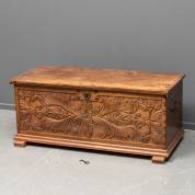 Eiken kist op slofpoten, het front met gestoken acanthusbladdecor, 19e eeuw -restauraties, krimpscheur-, 49 x 115 x 52 cm