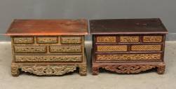 Twee roodgelakte houten ladekastjes met gestoken ladefronten, Indonesië, eerste helft 20e eeuw -gebruikssporen-, 33 x 52 x 28 cm