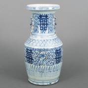 Chinees porseleinen vaas met blauw-wit decor en twee paar geappliceerde dieren in de hals, 19e eeuw -barsten in hals-, 43 x Ø 22 cm