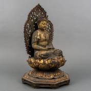Japans houten beeld: zittende Amitabha boeddha, in zijn handen een medicijnpotje, zittende op een dubbele lotustroon, zijn mandorla met rijk gestoken floraal decor, met resten van verguldsel, 20e eeuw, 56 cm