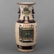 Gecraqueleerde Chinees porseleinen vaas met famille verte decor: wierookvaten en tekst, gemerkt, Nanking, 19e eeuw -hals gelijmd-, 45 x Ø 20 cm