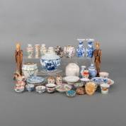 Divers Aziatica, waaronder: drie snuifflesjes, porseleinen kommetjes en schoteltjes, cloisonné dekselpotje, etc.