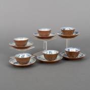Zes Chinees porseleinen kommen en zes schotels met diverse blauw-witte decors en capucijner buitenzijde, 18e eeuw -twee kopjes met randschade-