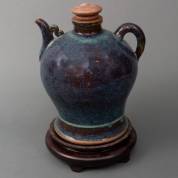 Chinese Yixing schenkkan met paars in blauw overlopend flambé glazuur, de hals voorzien van houten stop, 20e/21e eeuw, staand op houten basement, 30 x 24 x 22 cm