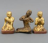 Eén bronzen en paar houten beeldjes van attendanten Thailand -houten beeldjes gelijmd bij hals, verguldsel sleets-, 16 cm