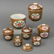 Zeven diverse Chinees porseleinen capucijner dekselpotjes, en een los deksel, 18e eeuw -defecten, één deksel manco-