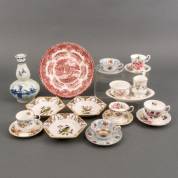 Delfts aardewerk fles met opwindbaar muziek mechaniek, drie aardewerk schaaltjes met polychroom vogeldecor, Makkum, aardewerk bord met rood transferdecor, Grindley Staffordshire, en diverse porseleinen serviesdelen, Ø 25,5 cm