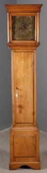 Engels staand horloge in eiken kast, de vierkante messing wijzerplaat met seconde- en uuraanduiding, 18e eeuw, 201 x 44 x 26 cm