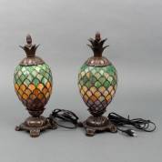 Paar ananasvormige glas-in-lood tafellampen met metalen monturen, Tiffany-stijl -één ornament van het deksel defect-, 39 x 16 x 16 cm