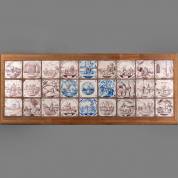 Tegeltableau bestaande uit 36 Delfts aardewerk tegels, waarvan 5 tegels met blauw-witte decors, en 31 tegels mangaankleurig -defecten-, 53 x 130 cm