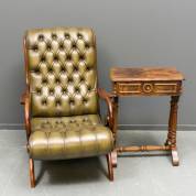 Mahonie armstoel met gecapitonneerde groen lederen bekleding, Engeland, tweede helft 20e eeuw, en mahonie naaitafeltje op onderstel van gedraaid houten poten, Hollands, 19e eeuw -droogtescheur in deksel-, 100 x 65 x 95 cm