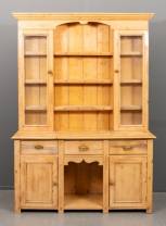 Grenen servieskast, in de opstand twee beglaasde deuren, in de onderkast drie lades en twee deuren, 20e eeuw, 215 x 152 x 48 cm