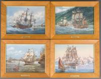 Vier porseleinen tegels met gedrukte scheepsdecors: 'The Resolution', 'The Empress of China', 'The USS Constitution' en 'The Prins Willem', naar Thomas Wesley Freeman, uitvoering Franklin Mint, 19 x 26,25 cm