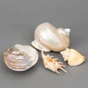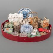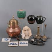 Divers kleingoed, waaronder: hardstenen schaaltje met fossielresten, Chinees gemberpotje, drie Delfts aardewerk tegels, en koperen doofpot
