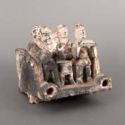 Chinese polychroom beschilderde aardewerk beeldengroep: vijf muzikanten in een kar, Han-stijl, aangekocht bij 'Gallery of Art, Aziatische Kunst en Antiek', Horst-L., Nederland, december 1979 -voet van muzikant linksvoor gelijmd, as voor de wielen aan beide uiteindes gebroken, aankoopfactuur bijgevoegd-, 26 x 26 x 27 cm