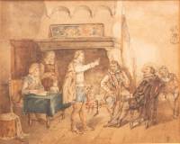 Hollandse School: historische scène van figuren bij haardvuur, gemonogrammeerd, verso toegeschreven aan Charles Rochussen, 19e eeuw, 15,5 x 20 cm