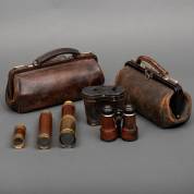 Twee lederen dokterstassen, verrekijkertje in lederen foedraal, en drie telescoopkijkers, diverse formaten -gebruikssporen-