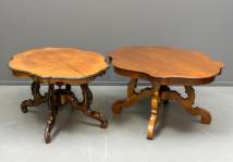 Twee mahonie spinnenkop salontafels met gecontourneerd blad, Willem III -onderstel ingekort-, 58 x 121 x 89 cm