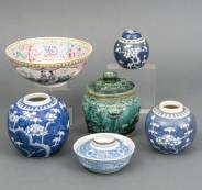 Vier diverse gemberpotten, porseleinen famille rose kom, en een bleu de Hue dekselkom -chips-, 8,5 x Ø 20,75 cm