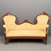 Mahonie vlinderbank met gele stoffering, de gecapitonneerde rug bekroond door krulvormige ornamenten, Hollands, biedermeier, 106 x 75 x 75 cm