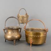 Bronzen grape met smeedijzeren handvat en reliëfdecor: tweekoppige adelaar, messing pan met koperen beslag, en bronzen pan op pootjes met smeedijzeren handvat