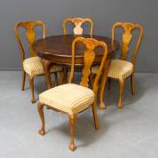 Wortelnoten schuiftafel met gecontourneerd blad, en vier essen stoelen met wortelnoten rug en gestreepte geel velours bekleding, alle 20e eeuw, 76 x 112 x 112 cm