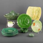 Diverse groengeglazuurde aardewerk serviesdelen met plantendecors, waaronder dekselschaal in de vorm van koolbladeren, gemerkt F. Mendes, Portugal, aspergeschaal, en zeven visborden -enkele lichte gebruikssporen-