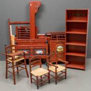 Rood- en floraal beschilderd multiplex Hindeloopen ameublement, bestaande uit: ledikant, boekenkast, babybox, babybedje, opvolgbed, hoge kinderstoel met blad, en paar kinderstoelen, waarvan één met armleuningen -gebruikssporen, enkele schroeven manco-