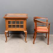 Eiken theekastje met afneembaar beglaasd dienblad, in de onderkast geslepen ruitjes, circa 1900, daarbij: mahonie armstoeltje met intarsia en rode stoffering -restauraties-, 83 x 72 x 50 cm