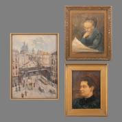 Drie wanddecoraties: Johannes Martinus Bach (1866-1943), lezende vrouw, aquarel en pentekening op papier, gesigneerd, Abraham Vles (1880-1967), 'Ludgate Hill, London', aquarel, gesigneerd en gedateerd, en marouflé: portret van een vrouw, niet gesigneerd -slechte conditie-