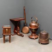 Mahonie latjestheestoof met koperen appelketel, koperen doofpot, beddenpan, mahonie theestoof of jardinière en mahonie wandtafel