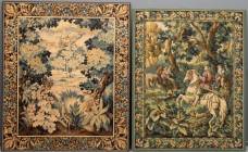 Twee gros-point wanddecoraties van groot formaat, de een met jachtdecor, de ander met bosdecor, 19e/20e eeuw, 168 x 142 cm