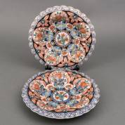 Paar aardewerk wandschotels met polychroom floraal decor en geschulpte rand, Makkum, Ø 33 cm