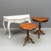 Grijsgeschilderde houten wandtafel met twee lades, rond mahonie theetafeltje met gecontourneerd blad en intarsia, en mahonie halvemaantafeltje met één lade -lichte gebruikssporen-, 73 x 108 x 48 cm