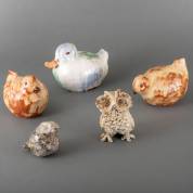 Paar bruingeglazuurde keramiek vogels, en wit-blauw-groengeglazuurde keramiek eend, gemerkt Anke en gedateerd '89, en twee geglazuurde keramiek uilen, waarvan één gemerkt met sticker 'Le Fronton', Beaune, Frankrijk
