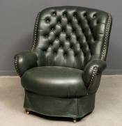 Groen lederen bergère met gecapitonneerde rug en siernagelranden, 92 x 87 x 95 cm
