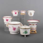 Zes porseleinen potten met roze en groene bloemdecors, waarvan twee met ramskoppen in reliëf, en een porseleinen potje met Rothschilddecor, alle uitvoering Herend, Hongarije, 20e eeuw