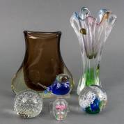 Dikwandige bruin glazen vaas, drie glazen presse-papiers, blauw glazen vogeltje, etc., alle Boheems glas, 29 cm