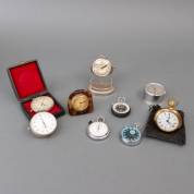 Vijf stopwatches, waarvan één in origineel verpakkingsdoosje, drie reiswekkertjes, waarvan één in messing kast en in fluwelen zakje, uitvoering Jaccard, en klokje in metalen kast met bijhorend uitdraaibaar compartiment, 11 x 8,5 x 7 cm