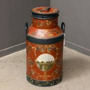 Hindeloopen beschilderde stalen melkbus met centraal een dorpsgezicht, met randtekst 'De Goede Verwachting', 60 x Ø 30 cm