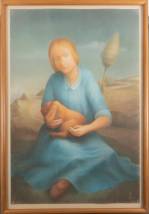 Hessel Miedema (1962), portret van jonge vrouw in blauwe jurk met konijn op schoot, zittend in een landschap met Utrecht in het verschiet, pastel, gemonogrammeerd, 114 x 77 cm