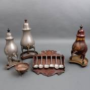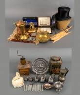Zes loden eenden, zwarte hoge hoed in doos, Perzisch tapijtje, kristal geslepen messenleggers en onderzetters, vergulde wandconsole, etc.