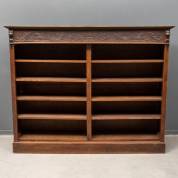 Open eiken boekenkast met gestoken fries, leeuwenmascarons en gecanneleerde zijstijlen, 20e eeuw, 150 x 190 x 45 cm