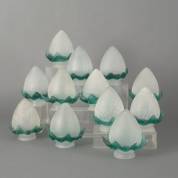 Serie van twaalf gesatineerd glazen conische hanglampenkappen met groene bladerrand, 17 x 15 cm