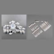 Porseleinen serviesgedeelte met blauw-wit Zwiebelmusterdecor, waaronder: veel kop-en-schotels, twee theepotten, roomstel en taartplateau, en bijbehorende bestekdelen, alle uitvoering Blue Danube, Japan -enkele chipjes-