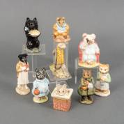 Negen keramische Beatrix Potter-figuren: 'Pickles', 'Ginger', 'Simpkin', 'Duchess', 'Tom Thumb', 'Little Pig Robinson Spying', 'Sir Isaac Newton', 'Pig-Wig' en 'Old Mr. Bouncer', alle uitvoering John Beswick, Royal Doulton, Engeland