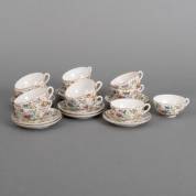 Serie van elf Japanse eierschaalporseleinen kop-en-schotels, plus een twaalfde kopje, met polychroom vogel- en bloemdecor -chipje-, 5 x Ø 12 cm