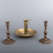 Messing verstelbare blaker -onderzijde met tinsoldeer-, en paar gebronsde messing tafelkandelaars