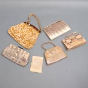 Vier diverse slangenlederen avondtasjes en een portemonnee, daarbij: velours tas -één hengsel defect-, 27 x 30 cm