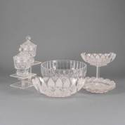 Divers geslepen kristal: gefacetteerde grote kom, paar dekselpotten, paar schalen en paar schotels -enkele kleine chipjes-